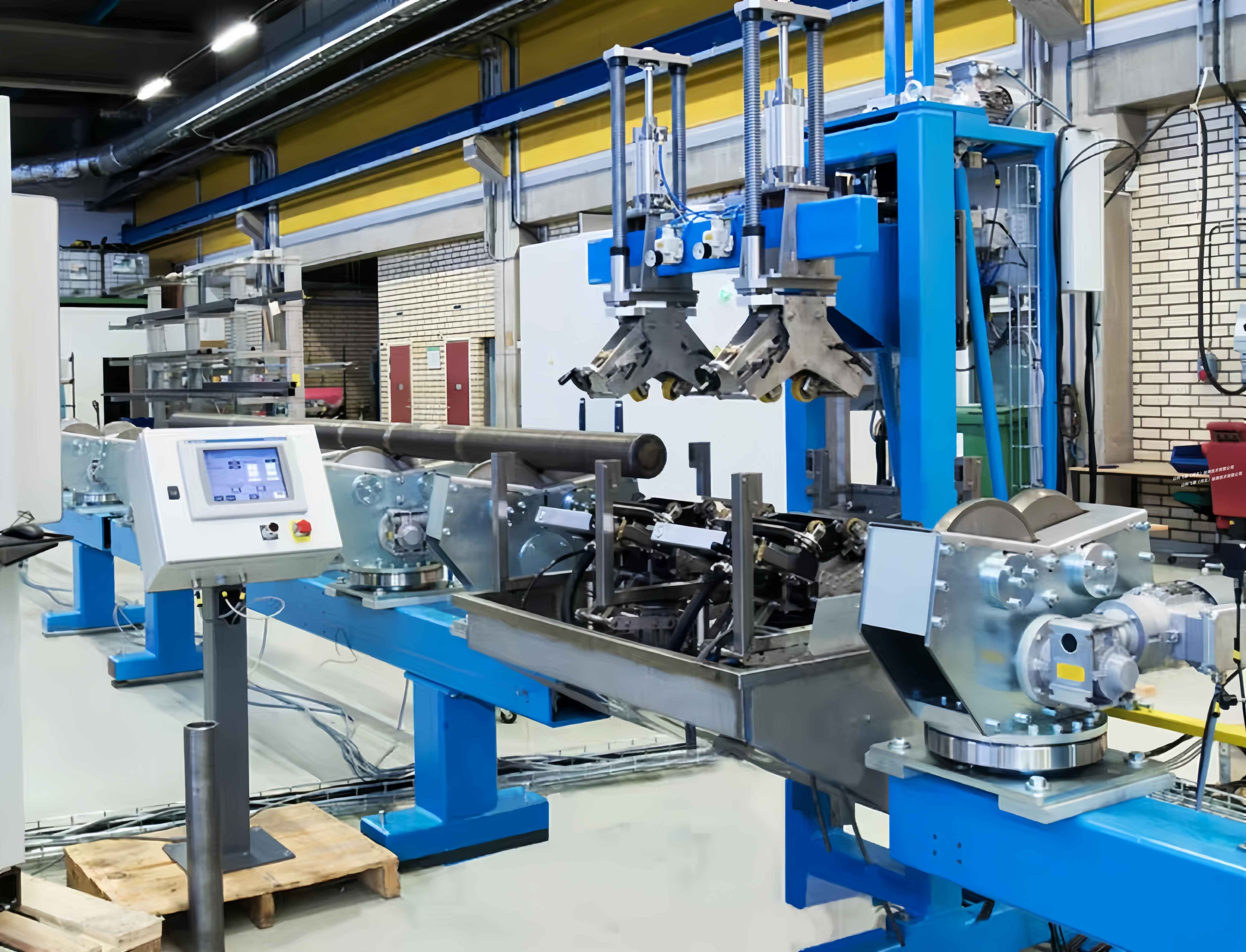 本款設備為不銹鋼圓棒材自動探傷設備,不銹鋼棒材探傷采用橫進橫出超聲波檢測。設備啟動,上料裝置將棒材撥送至旋轉輥道上,旋轉輥道驅動棒材原地旋轉,檢測探頭沿直線導軌水平運動,通過感應開關感應到棒材端部時停止,探頭落下開始檢測,探頭沿棒材表面直線移動,完成對棒材棒體部分的螺旋線式全覆蓋掃查。探頭與棒材探傷表面以水做為耦合劑。掃查完畢下料裝置動作將棒材撥送至下料臺架,根據有無缺陷將棒材送至正廢品料槽。